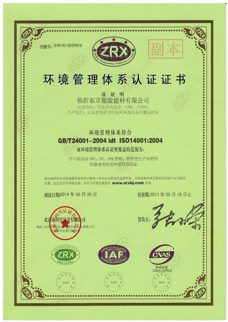 環(huán)境管理體系認證證書