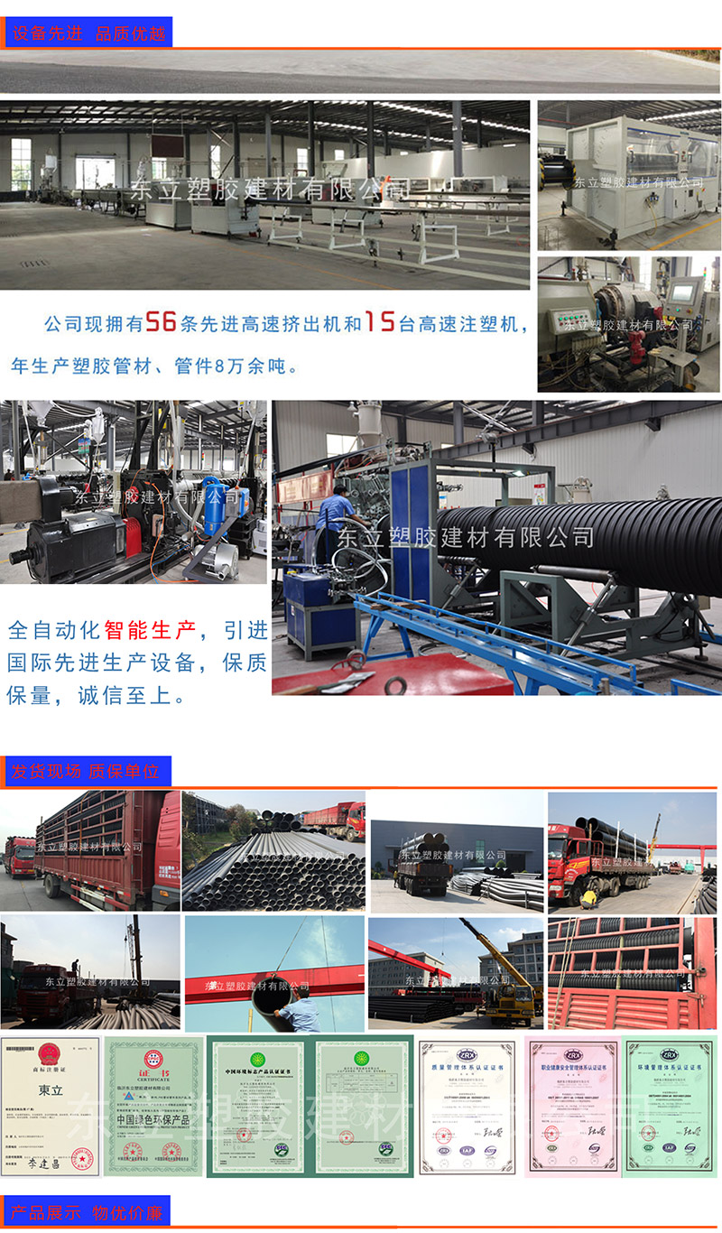 PE管采用目前世界上最先進(jìn)的技術(shù)生產(chǎn)制造的,具有高速擠出成型,熔融適度,自動(dòng)定尺切割,PLC控制生產(chǎn)全過(guò)程的先進(jìn)性能。